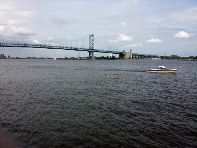 Weiter geht es dann mit der Library Hall, in der die Unabhängigkeitserklärung verfasst wurde, die man aber leider nur besuchen kann, wenn man sich vorher im Independence Visitor Center kostenlose Karten abgeholt hat. Ich war zu faul, wieder zurückzugehen, und habe mich – vorbei an einigen weiteren Gebäuden aus der Zeit der frühen Nation – in Richtung Delaware River gemacht. Hier soll, geschätzte 80 km von Mündung in den Atlantik entfernt, William Penn, der Gründer der damals noch britischen Kolonie Pennsylvania, 1682 gelandet sein. Allein für den Ausblick über den Fluss lohnte der Besuch, wenngleich er bei meiner Ankunft nicht von kolonialistischem Pioniersgeist, sondern viel mehr von der Stimmung einer mexikanischen Unabhängigkeitsfeier begleitet wurde, die an diesem Tag dort stattfand. Mehr oder weniger unbeeindruckt von den atztekischen Tänzern auf der Bühne und den Leuten am Nesquik-Stand, die kostenlos ein neues Kakao-Produkt verteilt haben („proudly made with real milk“), bin ich mit Schlenker über den Washington Square (mehr Statuen, wer hätte es gedacht) noch zum Geheimtipp meines Reiseführers gegangen, dem Reading Terminal Market. Wahrscheinlich wäre ich besser ein bisschen früher in den in einem ehemaligen Bahnhof eingerichteten „gastronomischen Basar“ gekommen – manche der Händler hatten ihre Waren bereits zusammengepackt. Dennoch konnte man durch die Gänge schlendern, frischen Fisch und frisches Gemüse kaufen (auch wenn die Erdbeeren im Angebot nicht mehr so frisch aussahen), und einen frisch gebrühten Kaffee to go – Sorte des Tages: Bollywood Blend – kaufen und sich anschließend sehr amerikanisch vorkommen.